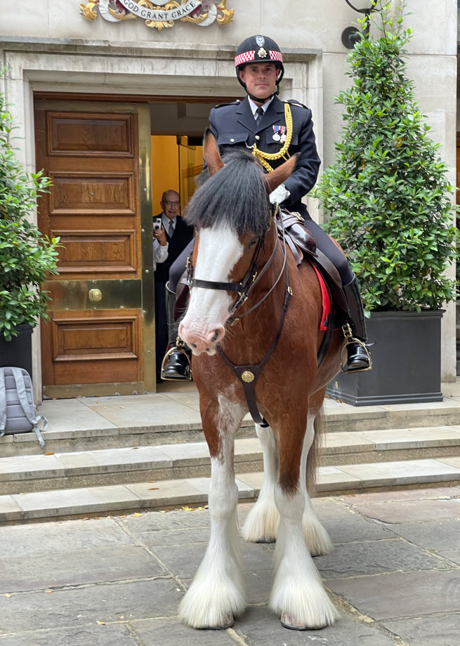 Ward members Graham Packham (a member of the City of London Police Authority Board) and John Griffiths enjoyed the unique ceremony at Grocers’ Hall to mark the completion of the training of PH Thomson as he joined the City Police mounted branch. Previous horses have been named after historically significant City sites or public figures with a City association.